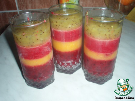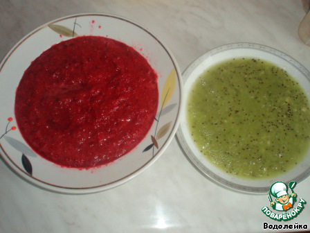 Теперь по поводу сока. Соки желательно использовать тех ягод или фруктов, из которых вы готовите. Но сока киви я никогда не видела, поэтому заменила на светлый виноградный(можно на яблочный). А сока смородины и вишни у меня просто не было.