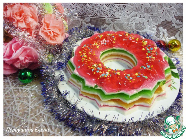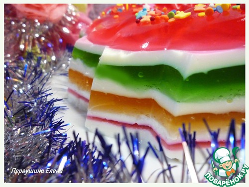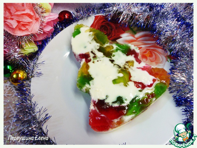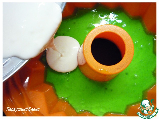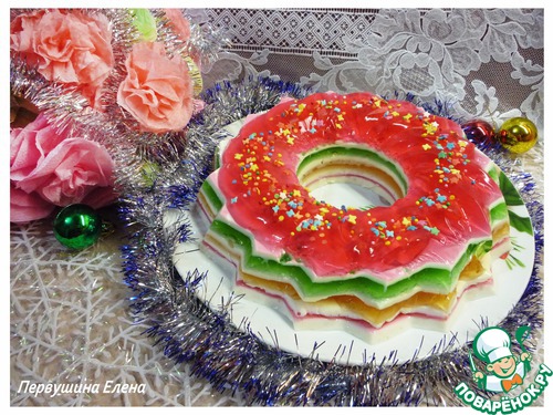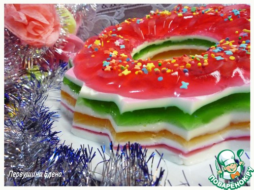 А это елочка бонусом! ;) Все так же, только ждем пока все жидкости застынут до киселеобразного состояния, и ложкой в середину выкладываем поочередно все желейные компоненты.