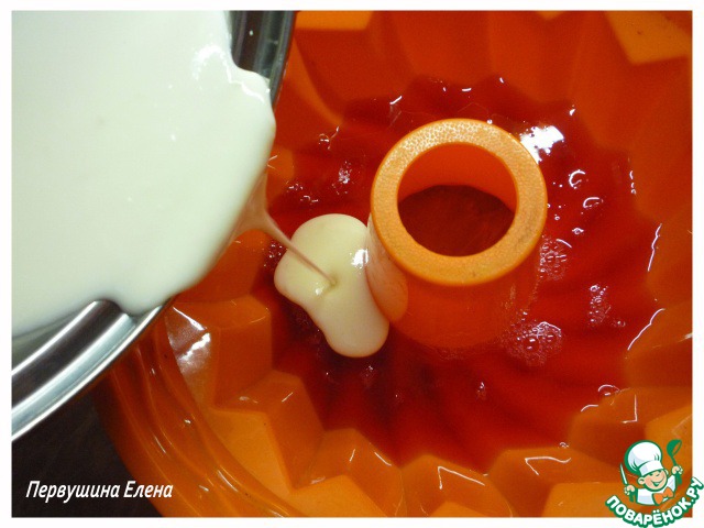 В красивую съемную форму наливаем половину вишневого компота. Выносим на холод, даем застыть, но до такой степени, чтоб поверхность осталась немного липкой (должно прилипать к пальцам). Это нужно для того, чтоб второй налитый слой, хорошо схватился. Выливаем на застывший слой с компотом, сметанно-молочный, тонким слоем.