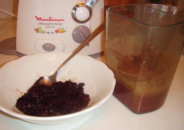 Лучше делать это в соковыжималке, но в случае её отсутствия можно отжать ягоды вручную в глубокой миске. Сок оставляем в стаканчике, а отжатую мякоть откладываем в отдельную посуду. Если вы использовали соковыжималку, то аккуратно соберите мякоть со всех её внутренних стенок (количество ягод небольшое и контейнер для отходов останется наверняка почти пустым).