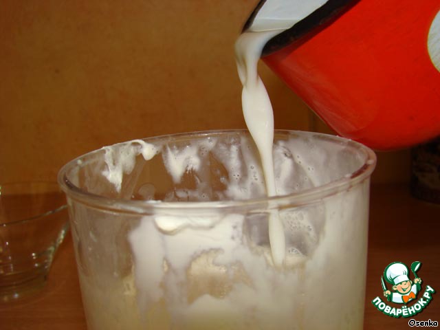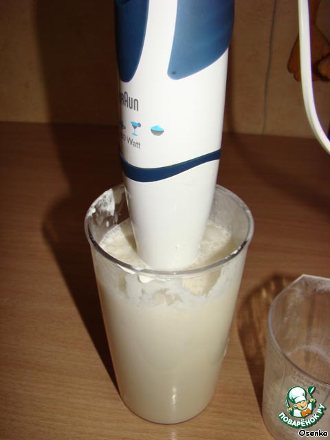 Взбить сметану с сахаром. Сахар добавлять по вкусу, пробуйте во время взбивания. Имейте в виду, что вы добавите стакан молока, и конечный продукт будет менее сладким.