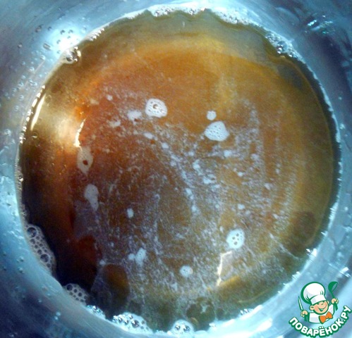 Начинаем делать первый слой. В сотейник налейте 70 мл. воды, нагрейте ее до горячего состояния. Не снимая с огня добавьте туда желатин и хорошо перемешайте массу. Туда же добавляем коричневый сахар 150 гр. Постоянно помешиваем сироп до полного растворения сахара и желатина.