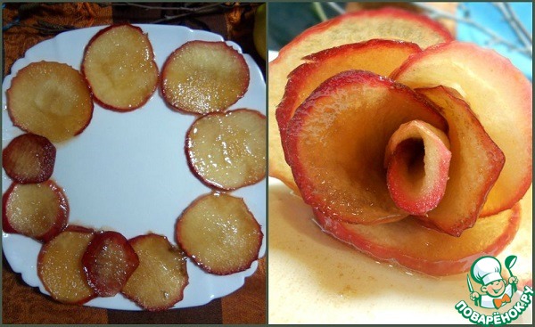 Затем лепестки выложите на тарелку, чтобы с них стек лишний сироп. Начинаем сворачивать розу. Серединку сворачивайте почти трубочкой. Затем прикладывайте по листику. Каждый лепесток слегка отворачивайте наружу.
