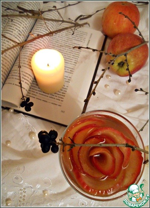 Вымытое яблоко разрежьте на тонкие полоски. Разрезать надо как можно тоньше. На сковороде приготовьте сахарный сироп из расчета на 0,5 ст. воды, 200 г. коричневого сахара. Яблочные дольки провариваем в сиропе, пока они не станут мягкими.