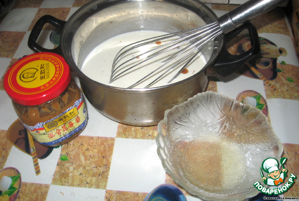 В кастрюльке смешать кунжутную пасту (купила у китайцев, очень переживала что это что-то не то, так как ни слова прочитать не могу), молоко, сливки и сахар.