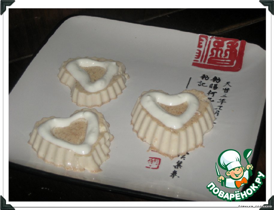 В рекомендациях к рецепту было указано украшать взбитыми сливками и зеленым чаем. От себя скажу, что зеленый чай я насыпать не стала, а вот взбитые сливки действительно отлично с ним сочетаются.