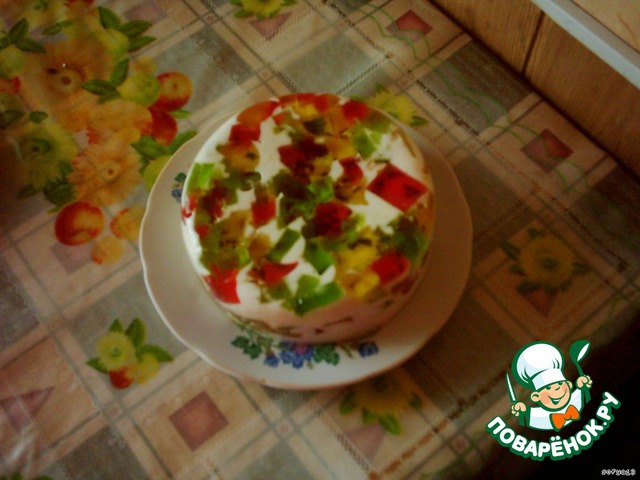 Разлейте в формы слоем около 1,5 см. Когда хорошо застынет, окуните форму на несколько секунд в теплую воду (чтобы желе отстало от краев формы). Порежьте желе кубиками, смешайте 3 цвета.