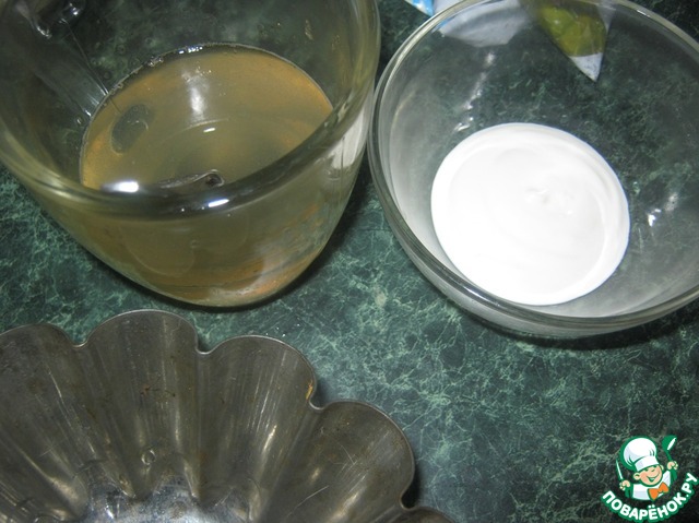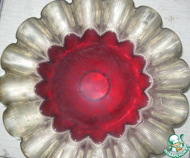 Заливаем первый слой (верх желейки) соком вишни и выносим на холод или убираем в холодильник минут на 15