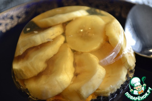 В винно-сахарную массу добавить лимонный сок, перемешать и залить бананы. Убрать в холодильник до полного застывания.