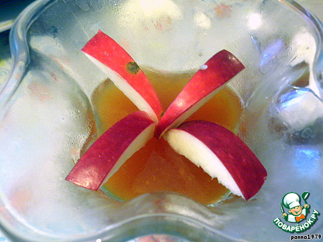 Яблоко нарезаем тонкими дольками и выкладываем ими узоры в формах с желе. Сложными узорами лучше не увлекаться, так как по мере заливки желе яблоко всплывет, и узор может нарушиться.