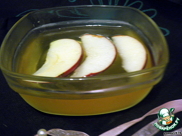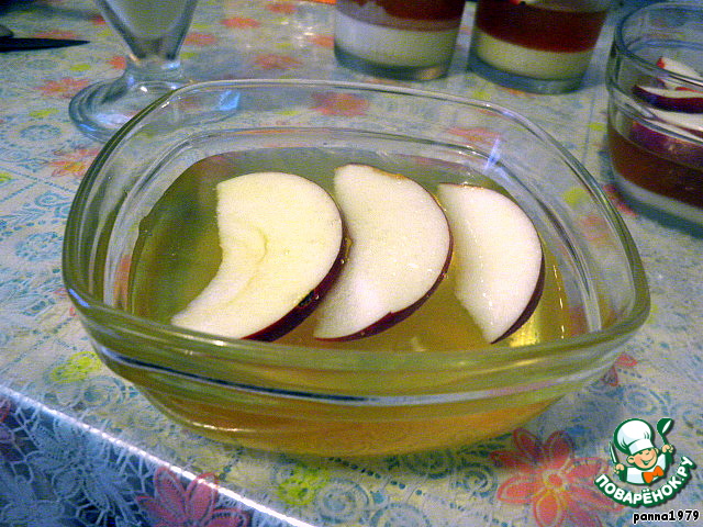 Заливаем аккуратно поверх яблок наше винное желе, лучше это делать ложкой. И опять ставим наше желе в холодильник, теперь уже до полного застывания.