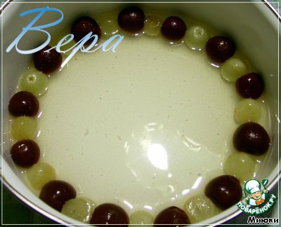 Выложить по краю, чередуя, черешню и половинки винограда.