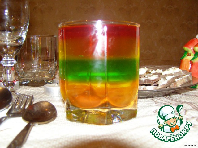 3 -4 пачки желе разного цвета по очереди растворить в воде и заливать в форму.