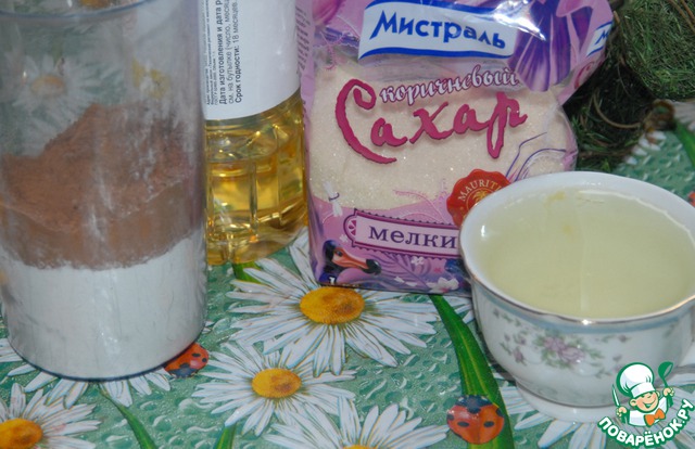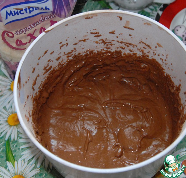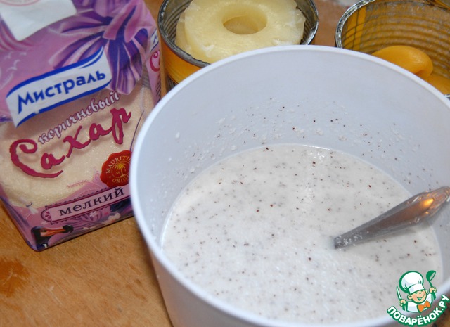 Духовку разогреваем до 200град. С персиков и ананасов сливаем жидкость в отдельную емкость, из нее отмеряем 250 мл. К ним добавляем растительное масло щепотку соли и полстакана сахара, постепенно вводим муку, какао и разрыхлитель.