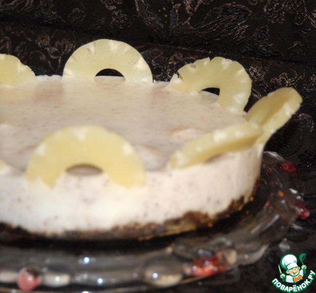 Фрукты можно порезать и добавить в кокосовую массу, а можно треть массы вылить на остывший корж, выложить половинки персика и поставить к бортам кружки ананаса. Залить оставшимся кокосовым желе и убрать в холодильник на 30 минут.