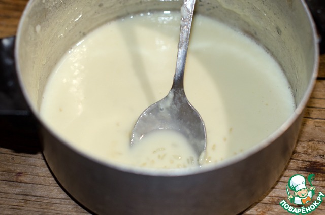 Желатин замочить в молоке и оставить набухать согласно инструкции на упаковке.
