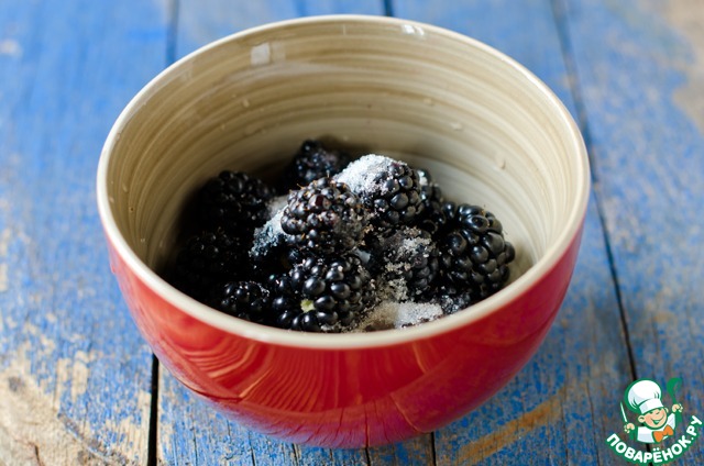 Теперь перейдем к приготовлению соуса, для этого горсть ежевике всыпать в миску, добавить 1 ст. л. сахара и 1 ч. л. сока лайма и пюрировать с помощью блендера.