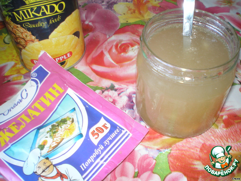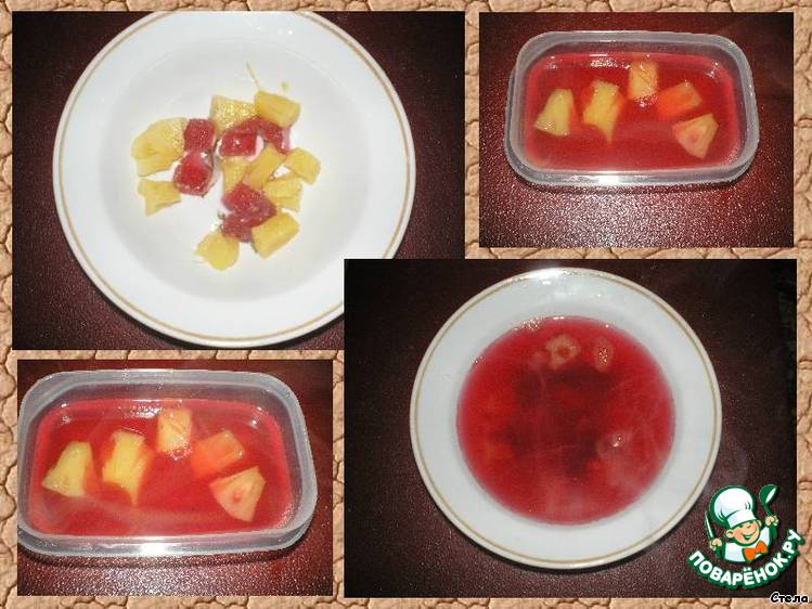 Нашла у себя в закромках)) фотки еще одного вида желе на вишневом соке - с ананасом и желе. Кусочки магазинного готового желе нарезала, добавила кусочки ананасов, залила соком и горячим желатином 50/50 и поставила в холодильник на полчаса.