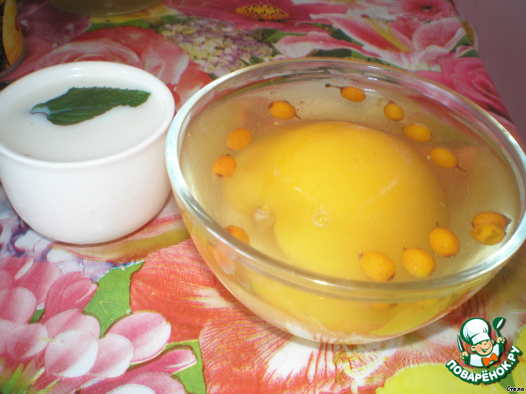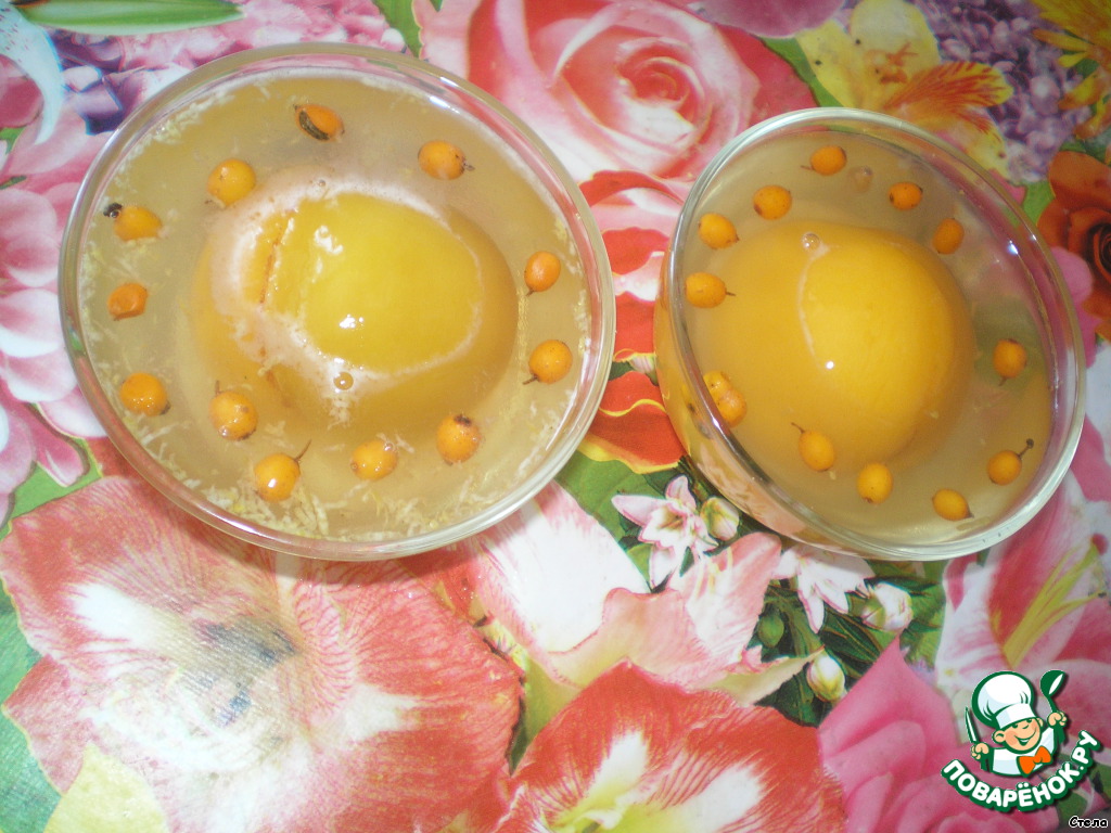 В заготовленную емкость выложила персики и залила наполовину сиропом, остальную половину залила горячим желатином.