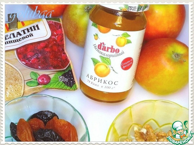 | Сейчас весна и витамины просто необходимы нашему организму. Я предлагаю вам вкусный десерт-желе из яблок, сухофруктов, орехов с абрикосовым низкокалорийным конфитюром D’arbo.. Конечно по сезону и по собственным предпочтениям, состав этого десерта можно менять на другие фрукты. |