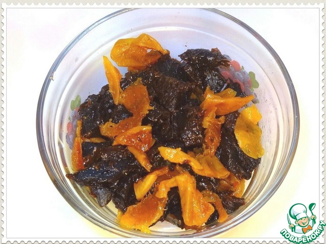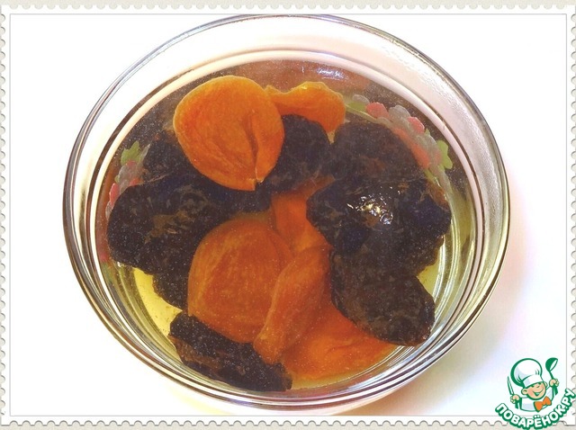 Чернослив и курагу хорошо промойте, замочите теплой водой на 1 час, чтобы сухофрукты стали мягкими.