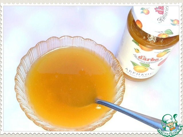 В 0,5 ст. яблочного компота (или вода от сухофруктов), оставшийся после замачивания яблок я добавила 6-7 ст. л. абрикосового конфитюра и размешала. Сахар я не добавляла, т. к. у меня яблоки были сладкие да и сухофрукты сладкие.
