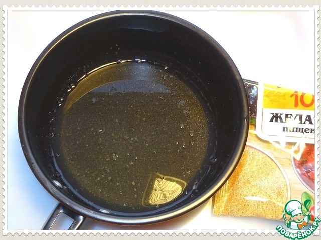 Желатин замочила в холодной воде (1:6) на 20 мин.. Я вместо воды использовала оставшуюся воду, слитую с яблок. Затем поставила желатин на небольшой огонь и разогревала помешивая, но не доводила до кипения. Влила к желатину абрикосовую смесь, немного прогрела, хорошо перемешивая.