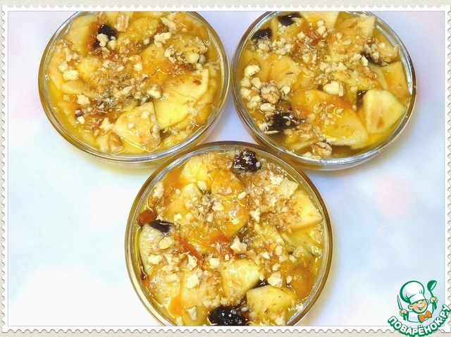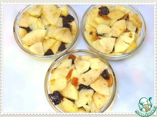 Из яблок слейте воду, добавьте к ним размягченные и порезанные сухофрукты, перемешайте и разложите поровну в креманки.