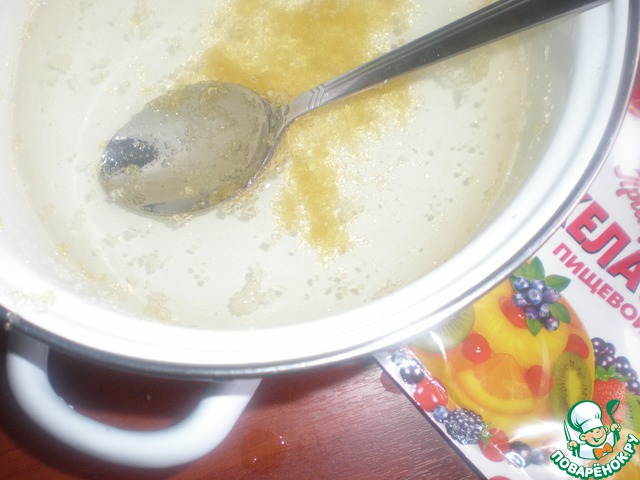 Желатин замочите в 400 мл горячей воды. В том случае, если желатин полностью не растворился, процедите его через марлю.