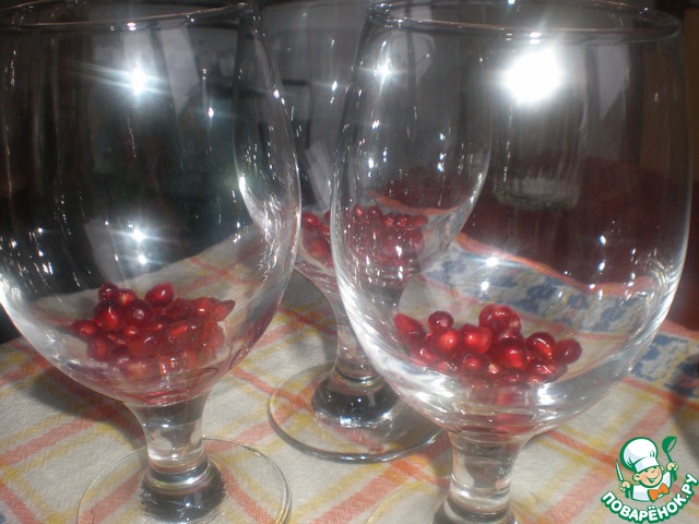 На дно формы для желе (будет красиво, если вы используете прозрачную форму, например, бокалы) выложите слой гранатовых зерен, залейте желейной смесью (небольшим объемом - мл 20).
