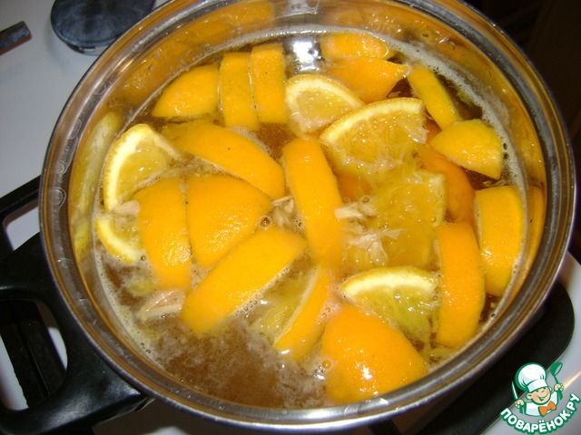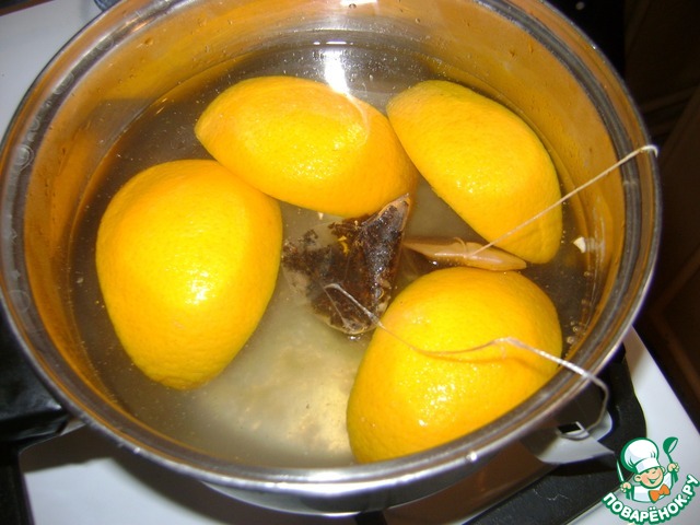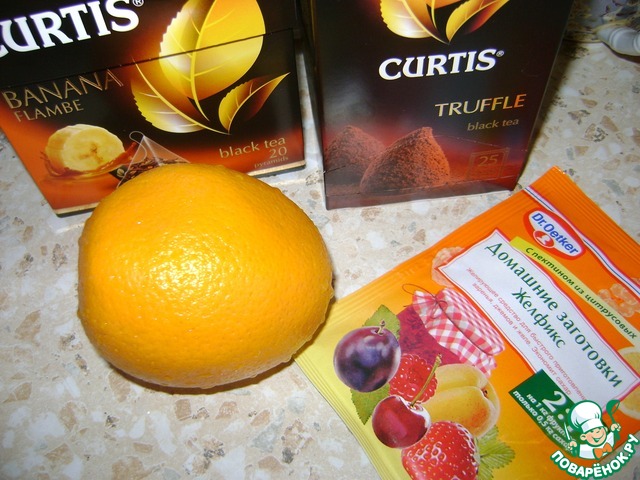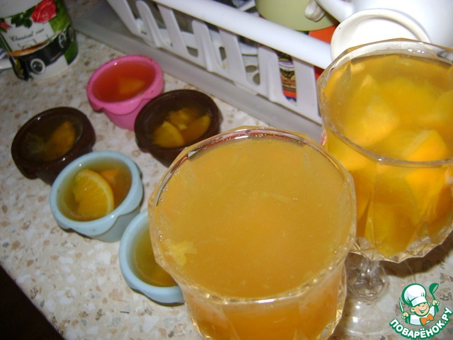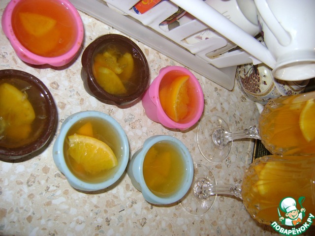 Апельсиновые дольки и агар-агар залить водой, туда же я положила и чайные пакетики (можно заварить чай и затем чаем залить апельсин;положить заварку и процедить и т. д. Но мой способ удобнее).