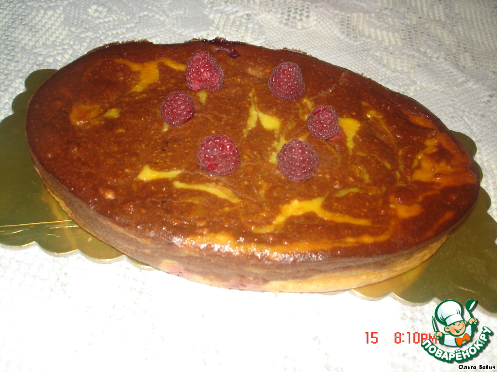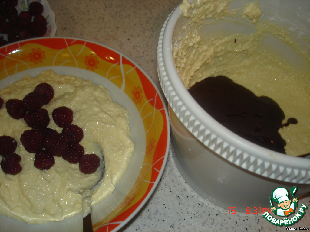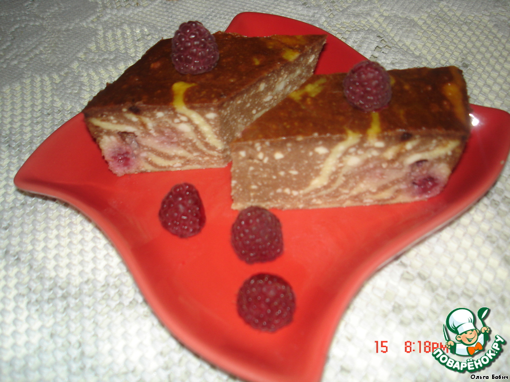 В форму, смазанную маслом, укладываем, чередуя, шоколадную и творожную массу с малиной.