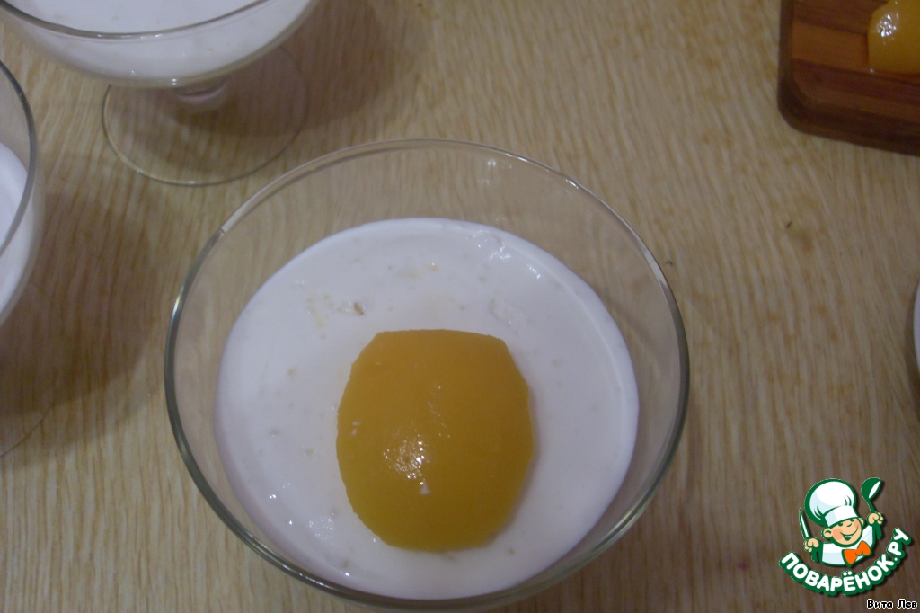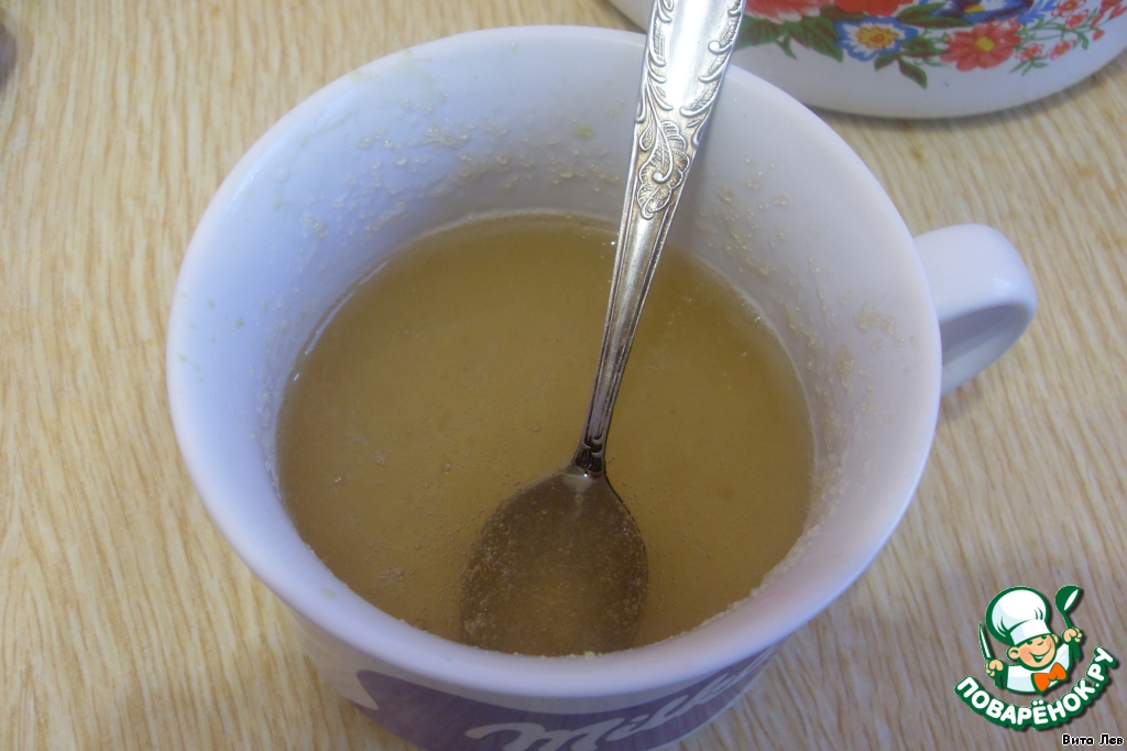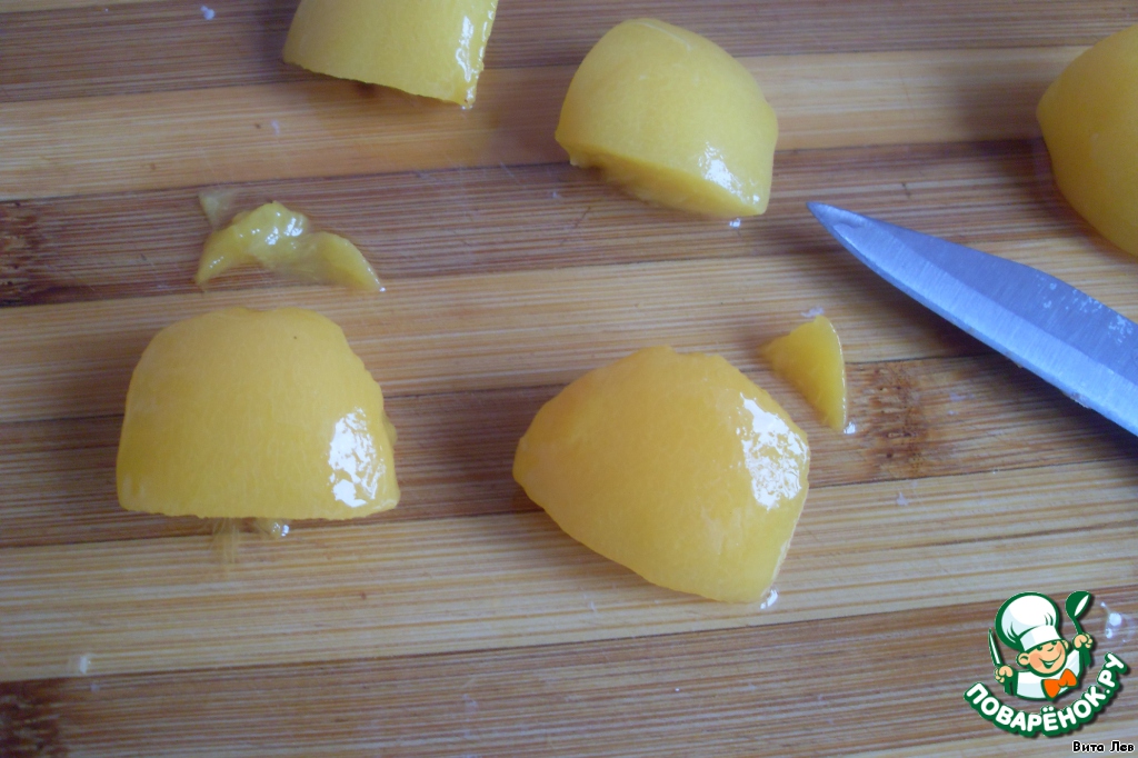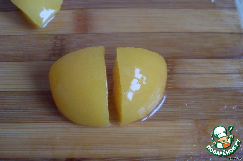 В первую очередь замачиваем желатин в 100 мл жидкости (вода, сироп от персиков или ананасов).