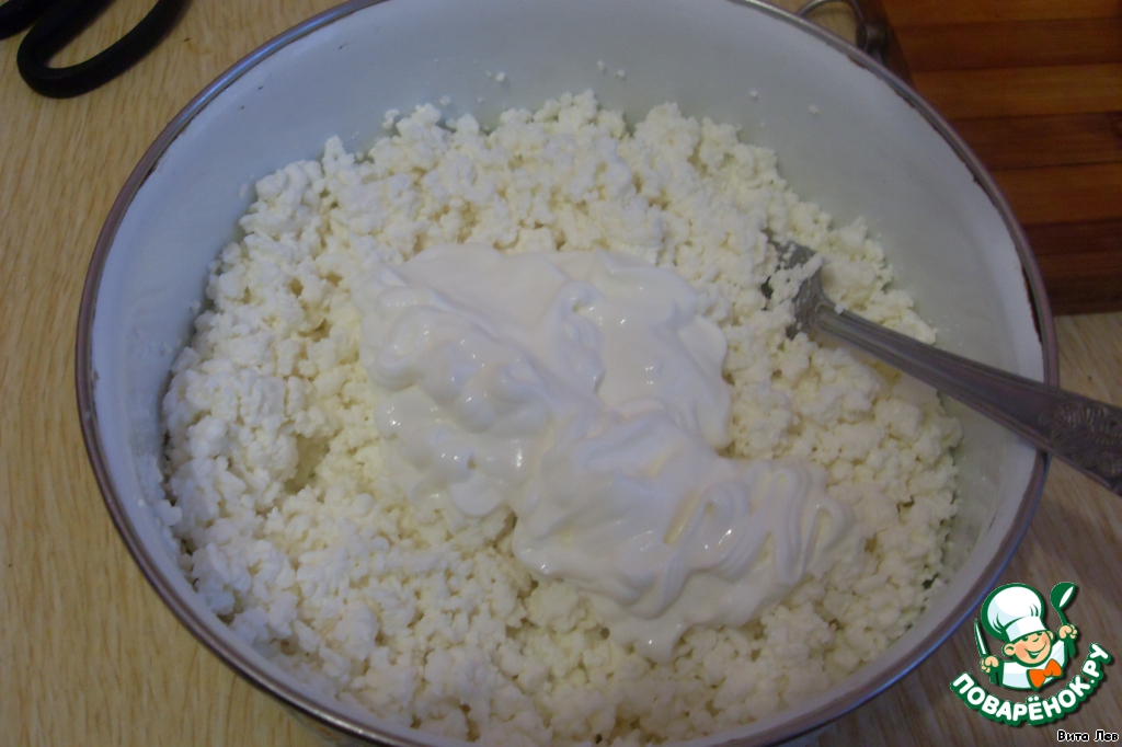 Творог смешиваем со сметаной, сахаром, можно дбавить тот же сироп,