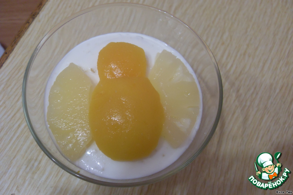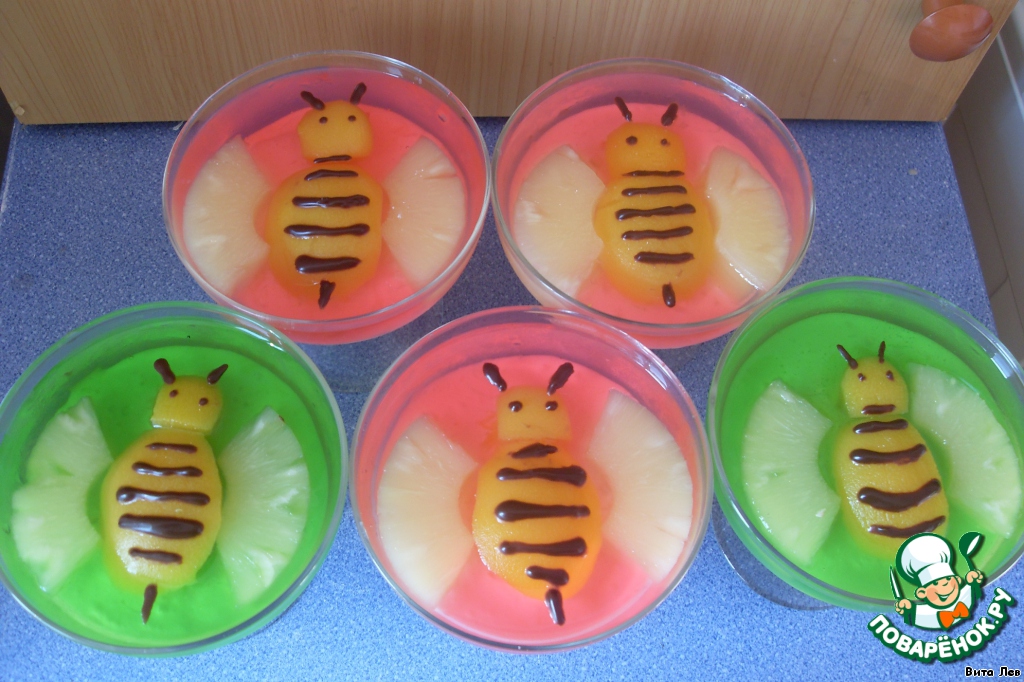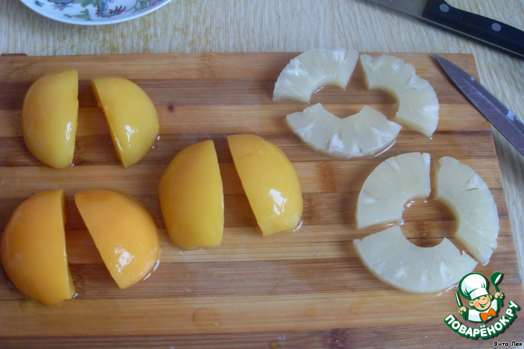 Займемся фруктами. Кольца ананаса (4 шт.) разрезаем на 3 равные части (это крылышки пчелки).