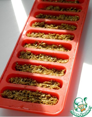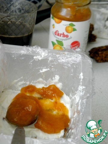 Далее - слой творога. На творог выложить слой из джема. И снова – «пальчики»-творог. Формочку на время убрать в морозильную камеру.