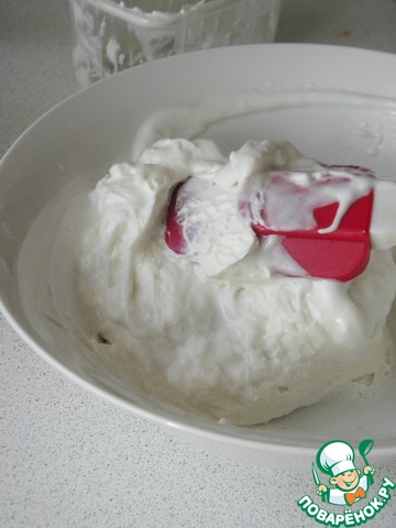 В творог лопаточкой аккуратно вмешиваем 2/3 швейцарской меренги (ориентируйтесь на свой вкус, можно вмешать и меньше меренги).