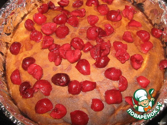 Основа из мягкого теста, покрытая слоем вишни, творожной начинкой и, в завершение, шоколадный штрейзель....