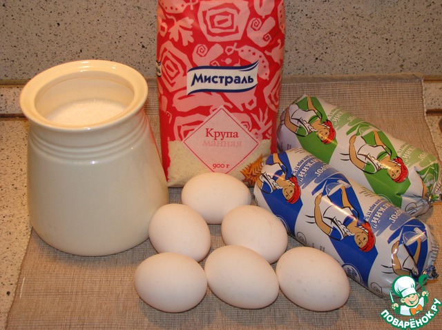 Нам понадобится: Творог мягкий, крупа манная ТМ "Мистраль", сахарный песок, яйца.