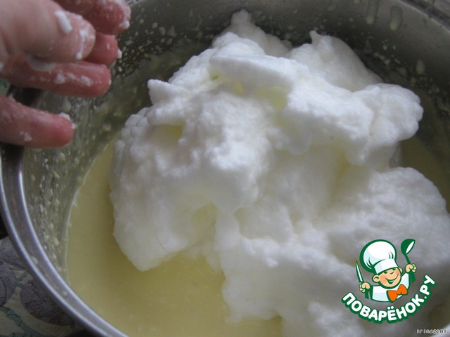 У яиц отделить белки и взбить со щепоткой соли в пену.