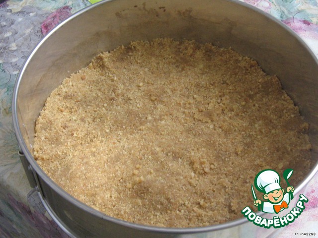Достать форму с основой из холодильника, вылить сверху творожную массу и отправить в духовку при 180 град. примерно на час. Через полчаса можно накрыть верх фольгой, чтобы лучше пропеклось. Внимание! Масло с основы у меня капало из дна формы, так что можно подставить под низ противень.