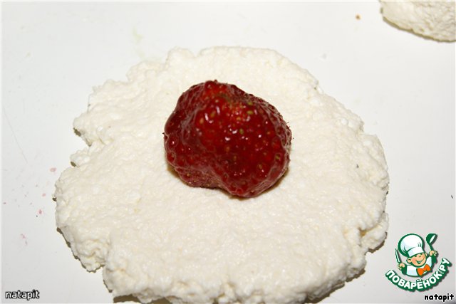 Распластать каждый шарик в лепёшку и поместить в центр клубничку.