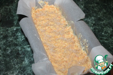 Форму проложить бумагой для запекания. Выложить творожно-морковную смесь и разровнять. Сверху присыпать панировочными сухарями.
