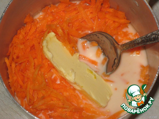 Mорковь натереть на крупной терке, залить молоком, добавить мед, масло, чуть посолить и тушить до мягкости морковки (7-10 мин.).