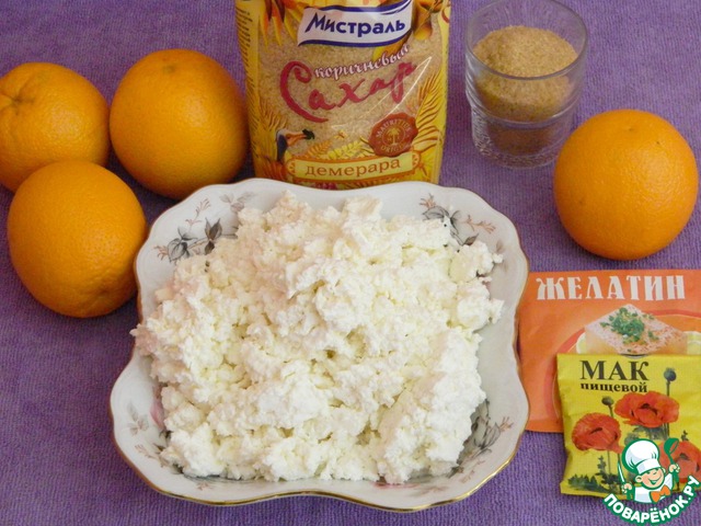 Приготовить продукты для торта: творог, сметану, сахар, мак, апельсины..