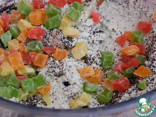 Добавить цукаты. Если Вы не любите цукаты, можно добавить любые фрукты или ягоды (кроме киви), изюм, а также кусочки мармелада, все, как подскажет фантазия.
