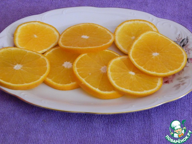 Апельсины тщательно помыть и вытереть насухо. Порезать на кружочки толщиной около 0,7 см. Если готовите для детей десерт, то шкурку можно аккуратно срезать с порезанных на кружочки апельсинов.