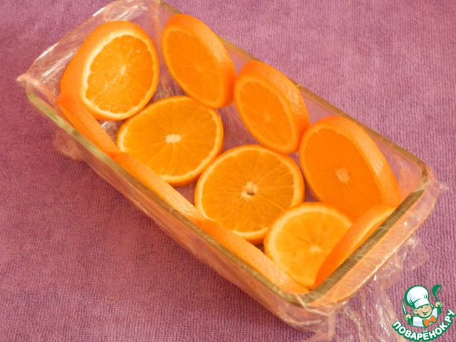 Уложить кружочки апельсинов на дно формы и по стенкам. Особое внимание уделить тем кружочкам, которые будут выложены на дне формы, так как при переворачивании торта это будет верх, а он должен быть красивым.