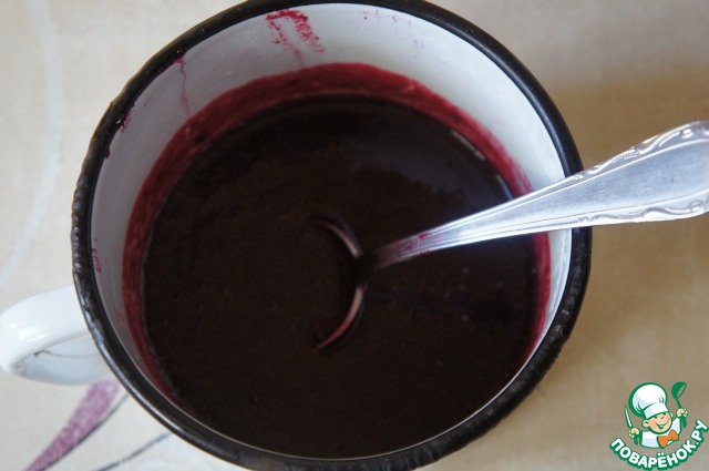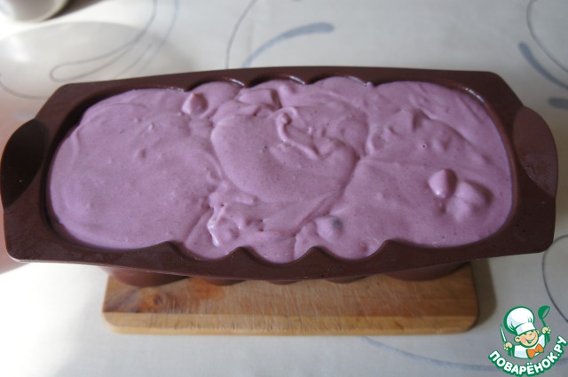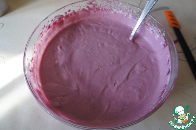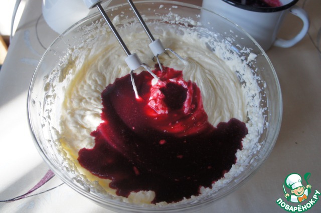 и соединить с черносмородиновым пюре. Влить пюре в творожно-сливочную массу и перемешать. Вот теперь готова наша творожная масса.