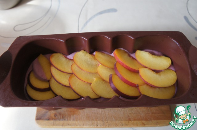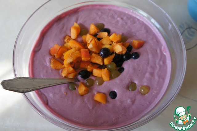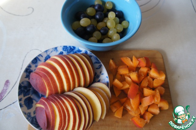 Подготовить фрукты. У меня был 1 персик и по веточке зеленого и черного винограда без косточек. Персик нарезала очень тонкими ломтиками.